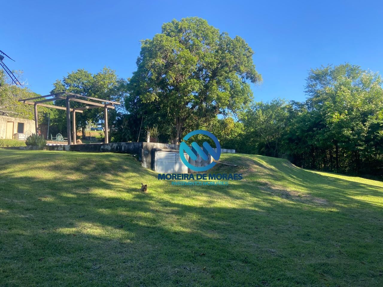 Terreno com aclive, parte plano e declive suave, com piscina, com uma casa pricipal e outra casa perto da piscina. As casas precisam de reforma. Possibilidade de construções diversas.